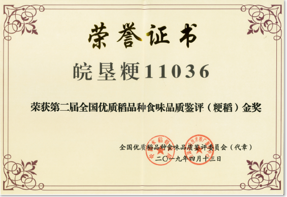 皖墾粳11036江蘇引種編號:(蘇)引種(2020)第038號,引種適宜區(qū)域:江蘇省長江以南地區(qū)。2019年皖墾粳11036榮獲第二屆全國優(yōu)質(zhì)稻品種食味品質(zhì)鑒評(粳稻)金獎。