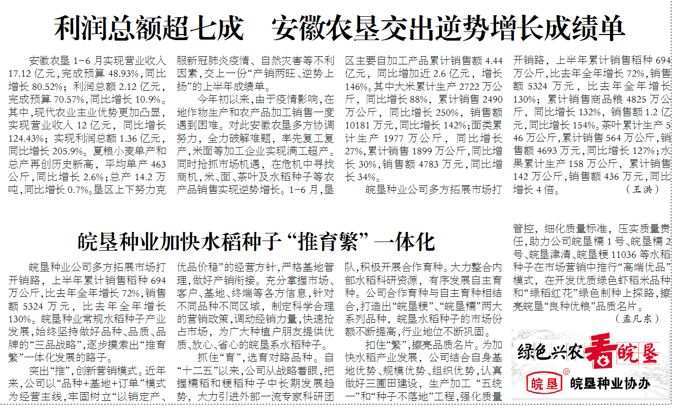 皖墾種業(yè)在安徽日報(bào)農(nóng)村版農(nóng)業(yè)周刊開辟“綠色興農(nóng)看皖墾”專欄