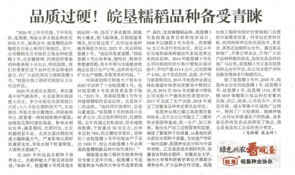 2021年01月22日“2020年上半年抗疫,下半年抗洪,是觀察、考驗眾多水稻品種優(yōu)劣勢的大年。縱觀全年,皖墾糯稻品種繼續(xù)在市場上保持引領地位。其中,公司糯稻北方市場的主推品種皖墾糯3號,在安徽蚌埠、河南信陽等地的種植表現(xiàn)十分出眾,特別搶眼。我們非常看好這個品種在懷遠等地的潛力,向廣大農民朋友力推皖墾糯3號。”皖墾生物工程研究院院長王永玖這樣說。