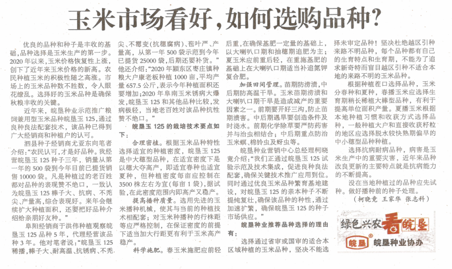 近年來,皖墾種業(yè)示范推廣糧飼兼用型玉米品種皖墾玉125,通過良種良法配套技術,該品種已得到廣大經(jīng)銷商和種植戶的認可。